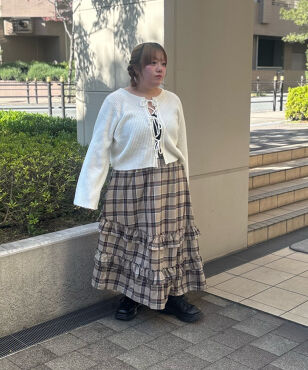7. アシンメトリーチェックフリルロングスカート