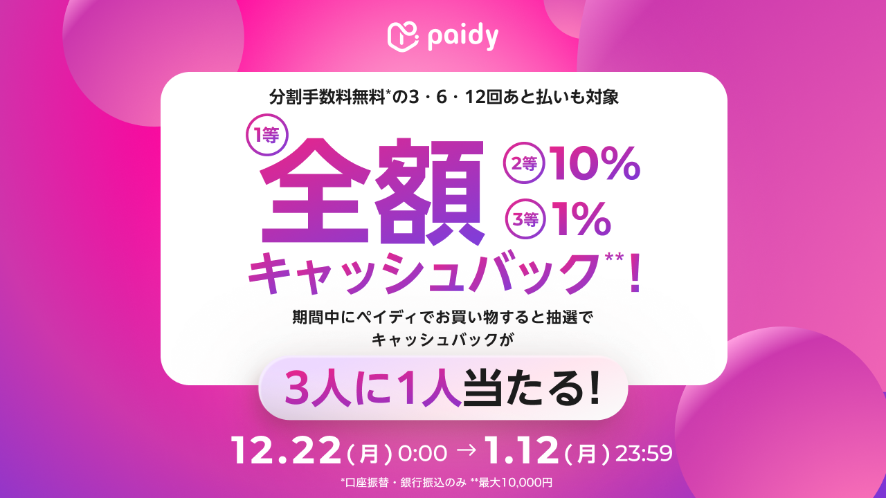 2025年12月22日(月)00:00〜2026年1月12日(月祝)23:59 ■キャンペーン概要・特典 キャンペーン期間中に対象ショップの決済画面でペイディを選択し、 お買い物すると抽選で3人に1人キャッシュバック*が当たります。 *最大10,000円 ※1回あたり1円以上の決済が対象 ※お一人様につき1回まで キャッシュバックはペイディアプリおよびMyPaidyに反映されます。 決済画面には反映されません。 ■キャンペーン対象 対象ショップの決済画面で「あと払い(ペイディ)」をご利用のお客様 >>注意事項等、詳しい内容はこちらから<< |